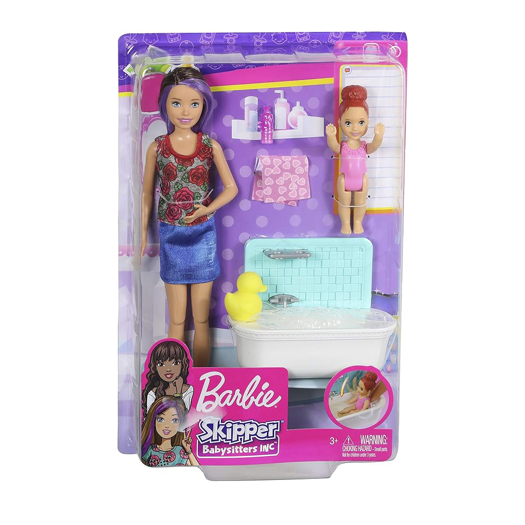 Kids can engage in classic babysitting role-play with Barbie Skipper Babysitters playsets, which include a baby doll, themed accessories, and a color-change feature. This set focuses on feeding and bathing.