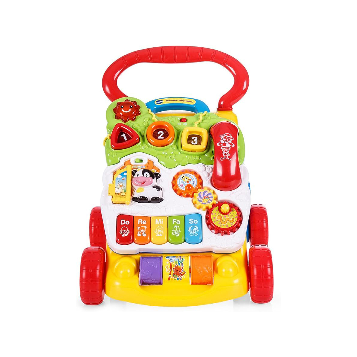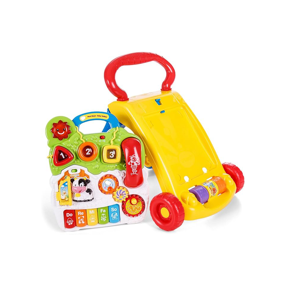 Vtech Baby First Steps Baby Walker introduces words, numbers, shapes, animals, and colors to your child. It includes a role-play mobile phone for added fun and engagement. The bright, light-up sun feature is designed to attract and captivate your baby’s attention.