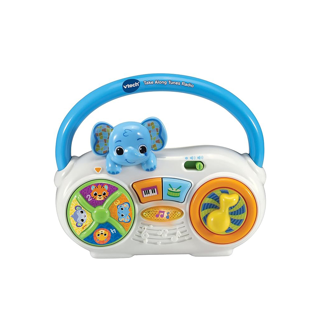 Tech’s Take Along Tunes Radio! This portable, retro-style baby boombox toy radio is designed for on-the-go fun.